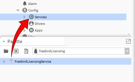• Connect to the local or remote station and open the freebirdLicensing palette and add the Service to the station services
