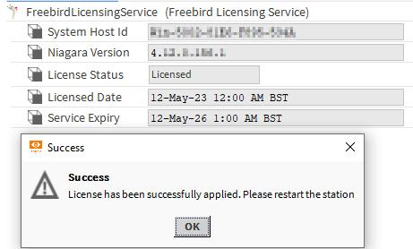 • Right click the FreebirdLicensingService in the station and go to Actions>Update License. In the popup paste the provided license key then click ok.